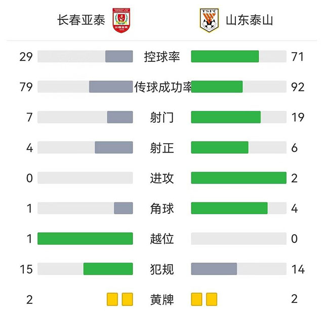 全场比赛结束,山东泰山2-1战胜长春亚泰。