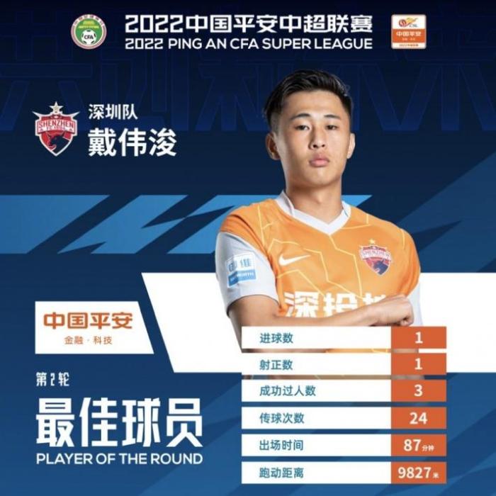 据悉,此次最佳球员是由球迷、媒体投票选出,戴伟浚在天津津门虎1-2深圳队比赛中,用一传一射的表现闪耀全场,帮助深圳队取得两连胜。
