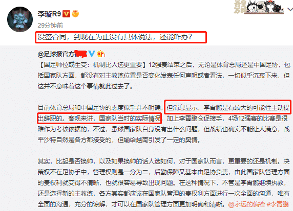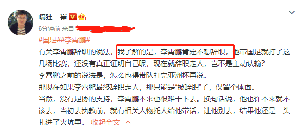而国内记者崔恒亮在社媒上也透露了更多的消息,据他了解,李霄鹏并不想主动辞职,因为李霄鹏还没有证明自己,现在辞职的话,就是主动认输。而如果李霄鹏真的辞职走人,只能是被辞职了,保留体面。
