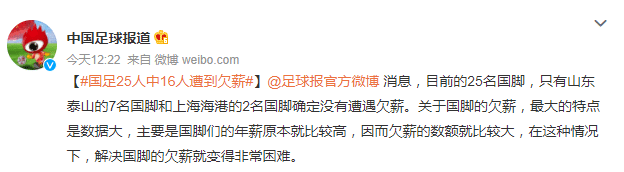 24直播网04月06日讯 《足球报》消息,目前国足25名球员中,只有山东泰山7名球员和上海海港两名球员未遭遇欠薪。
