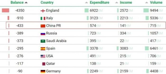 3、中国-4.33亿欧元(收入1.41亿欧元支出5.74亿欧元)