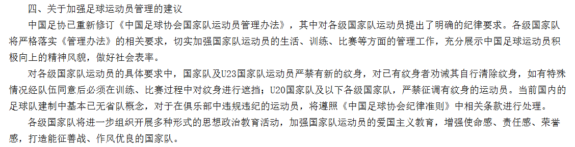 中国足协已重新修订《中国足球协会国家队运动员管理办法》,其中对各级国家队运动员提出了明确的纪律要求。各级国家队将严格落实《管理办法》的相关要求,切实加强国家队运动员的生活、训练、比赛等方面的管理工作,充分展示中国足球运动员积极向上的精神风貌,做好社会表率。