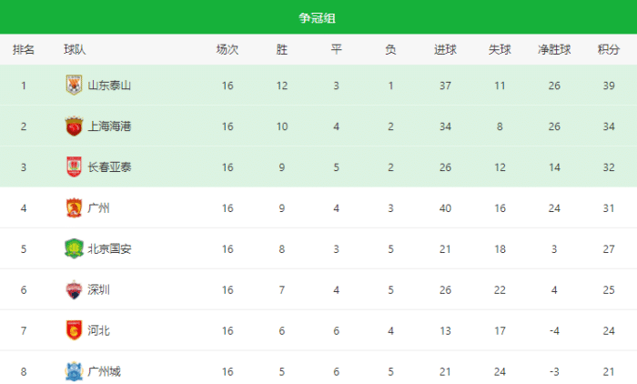 山东泰山本轮对阵国安,京鲁大战也上演了神剧情,张玉宁破门之后,山东泰山逆转,其中贾德松的绝杀球出现在伤停补时阶段,山东泰山取得3分继续领跑争冠组。海港本轮的比赛开球时间很晚,他们以1-0击败广州城,吕文君完成破门,继续紧追榜首。长春亚泰依旧是本赛季的黑马,16轮之后他们的积分来到32分。广州队本轮没有取得胜利非常可惜,面对河北队,他们一度取得优势,无奈的是被对手扳平,郑智无缘执教首胜,还吃到了黄牌。