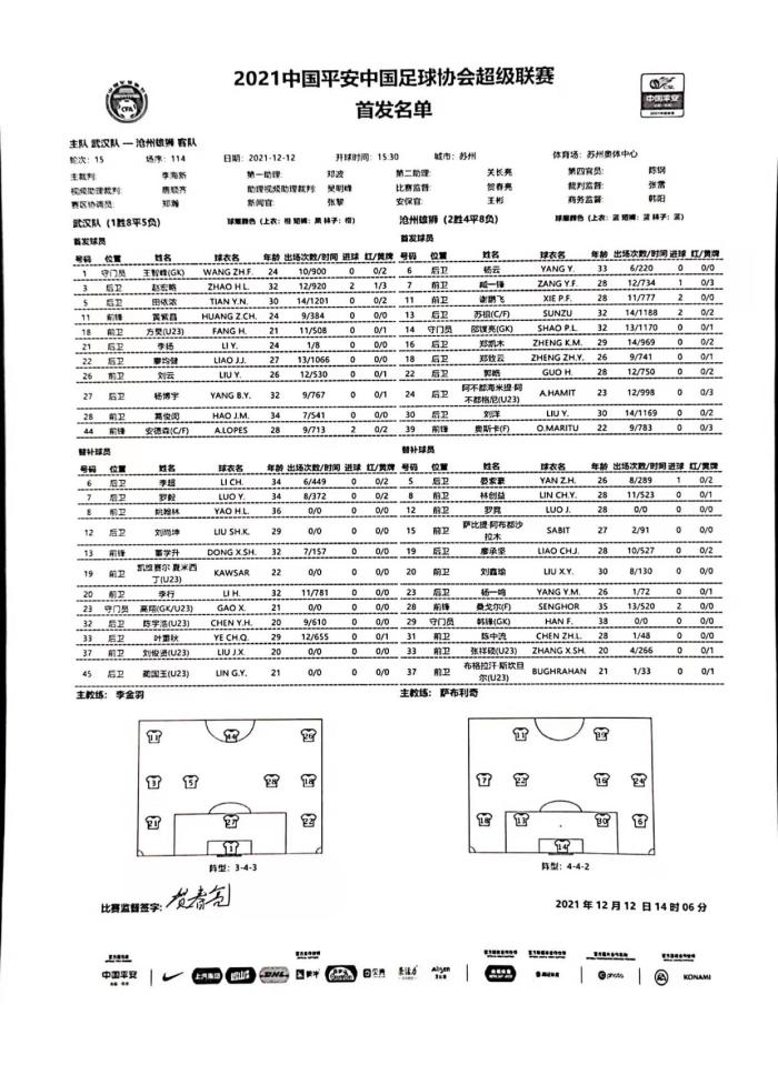 24直播网12月12日讯 ,中超联赛保级组的比赛正式展开争夺,武汉队对阵沧州雄狮。本场比赛的首发出炉。