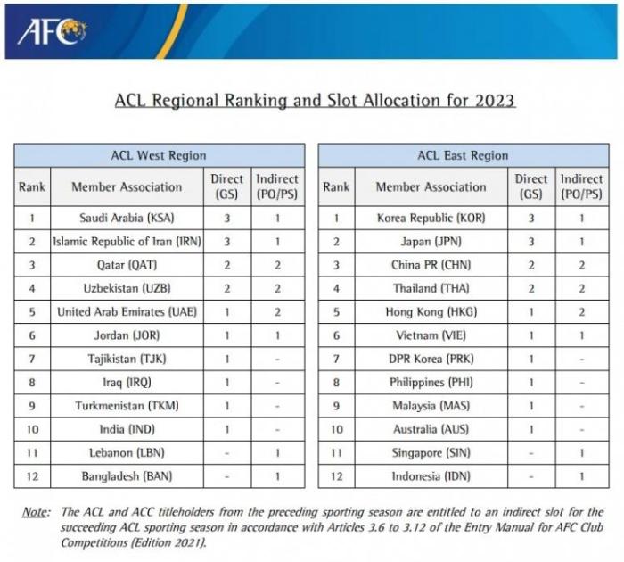 2023年的亚冠联赛席位根据各个地区俱乐部参加亚冠的比赛积分确定,在目前的亚足联排名中,沙特、韩国和日本排名前三,中超球队2021年亚冠成绩不佳,仅获得0.8分,下降至亚足联第七位。