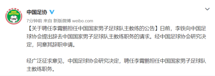 经广泛征求意见,中国足球协会研究决定,聘任李霄鹏担任中国国家男子足球队主教练职务。