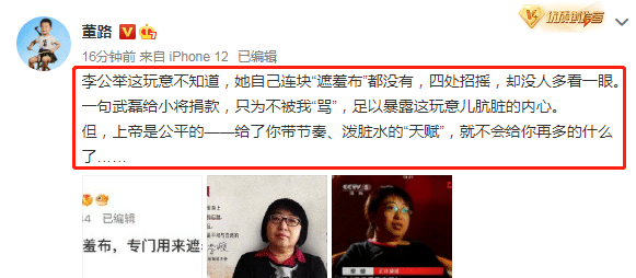 董路在社媒上发布了三张照片,第一张是李璇此前更新的社媒动态,是暗讽董路。而第二张和第三张是李璇的照片,而董路发文表示,“李公举这玩意不知道,她连这块遮羞布都没有,四处招摇,却没人多看一眼。一句武磊给小将捐款,只为了不被我骂,足以暴露这玩意肮脏的内心,但上帝是公平的,给了你带节奏,泼脏水的天赋,就不会给你再夺的什么了”。不知道李璇接下来是否会回应董路的言论。