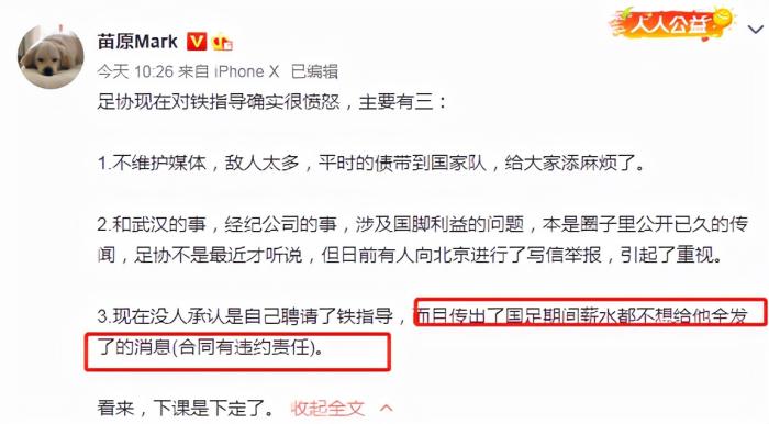而苗原也同样爆料了一则消息,现在中国足协没有人承认是他们聘用了李铁,而且传出李铁担任国足主帅期间的薪水,都不想给李铁了,原因是合同里面有违约责任。最后,苗原表示,看来,李铁下课是下定了。