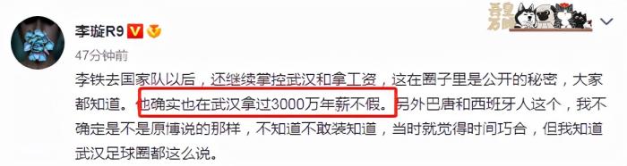 而国内记者李璇也在社媒上发文,确定李铁在武汉队执教时,确实拿着3000万年薪,而且,在担任国家队主帅之后,还继续掌控武汉队,并且拿着在武汉队的工资。也就是说,李铁拿着两份薪水,如果爆料属实的话,在业内肯定也会引起热议。