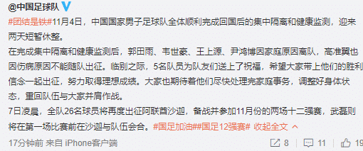 24直播网11月05日讯 今天国足官方宣布了5名球员离队的消息,这是国足近期首度宣布有球员离开本届12强赛,他们分别是郭田雨、韦世豪、王上源、尹鸿博因家庭原因离队,高准翼也因伤病原因不能随队出征。此前的报道显示国足在阵容上除了会做减法之外,还会做加法,也就是进行人员上的补充。具体的出征名单,将会在最后时刻才能够确定。