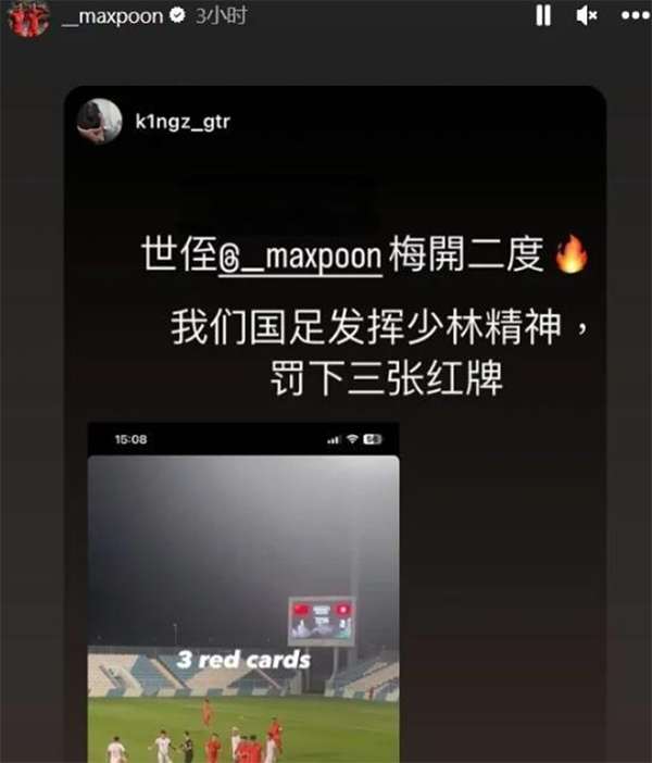 比赛结束之后,这位两度洞穿国足球门的悍将潘沛轩在社交媒体上转发了动态,并配文:我们国足发挥少林精神,罚下三张红牌。