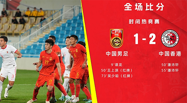 24直播网01月02日讯 国足在亚洲杯之前最后一场热身赛,以1-2不敌中国香港,时隔38年再度不敌对手。这场比赛是封闭进行的,没有直播,本场王上源和吴少聪先后染红,关注度助教也被红牌驱逐,最终国足在通过谭龙先进一球的情况下,被中国香港逆转,对手进球的是潘沛轩,他上演梅开二度的好戏,逆转击败国足。