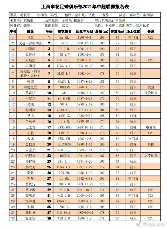 2021-22赛季中超上海申花球员名单一览