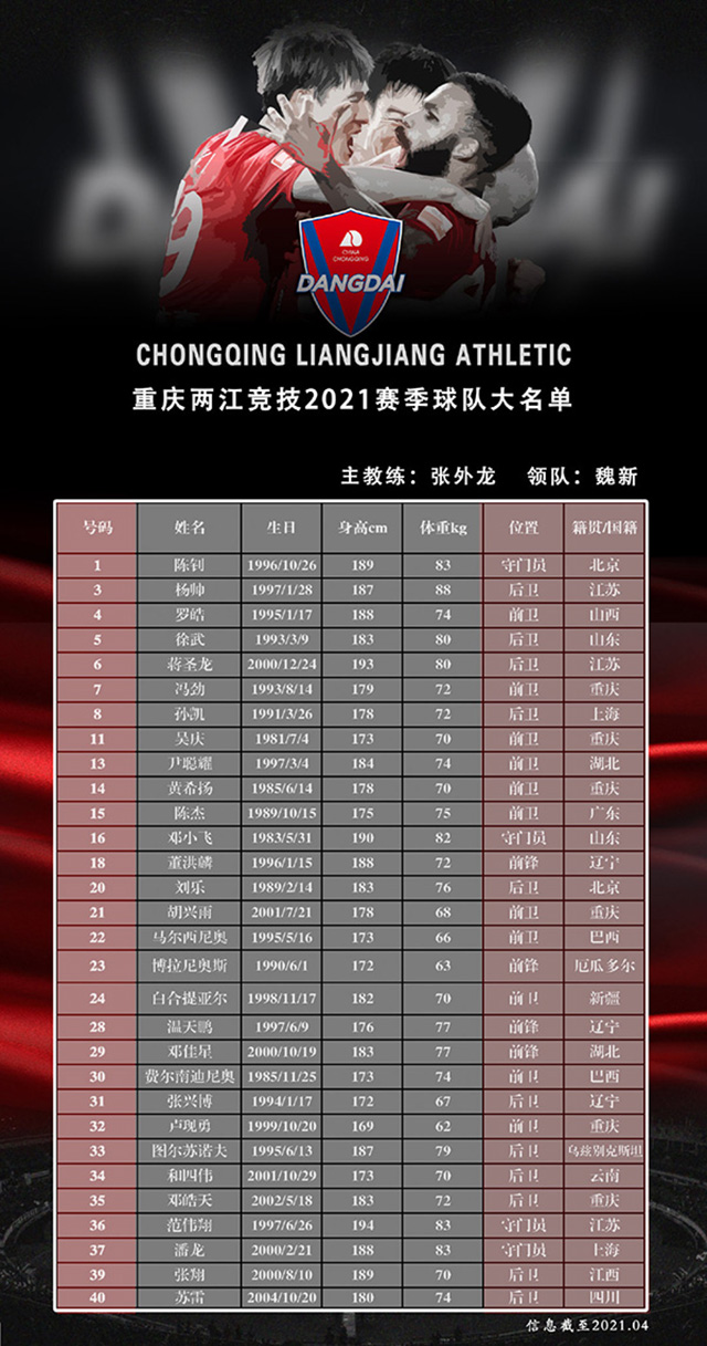 前锋:冯劲、吴庆、马尔西尼奥、温天鹏、邓佳星、费尔南迪尼奥