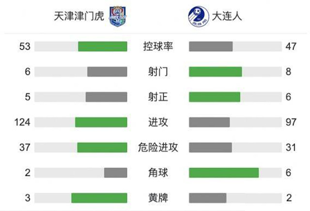 全场比赛结束,大连人3-1战胜津门虎。