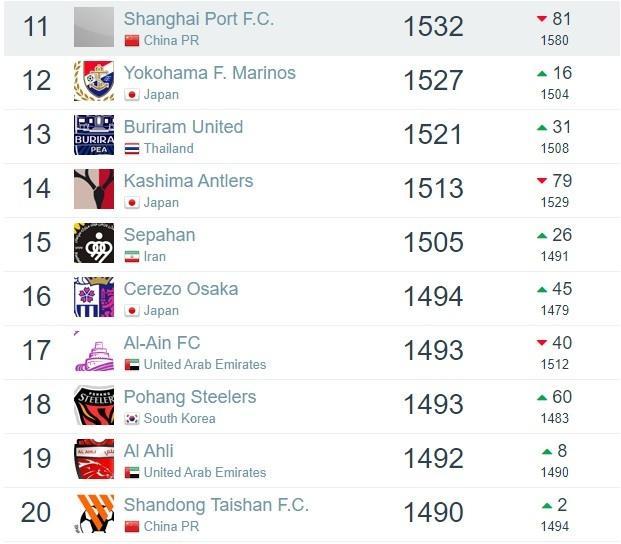 国内排名最高的是上海海港,位列亚洲第11位,山东泰山排在第20位,广州队和北京国安分别排在第25和26位。