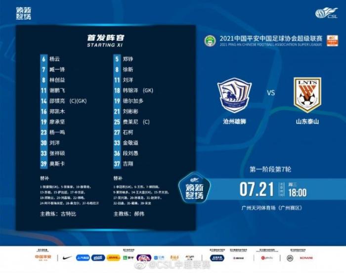 24直播网讯 沧州雄狮首发:14-邵镤亮、6-杨云、16-郑凯木、19-廖承坚、23-杨一鸣、30-刘洋、7-臧一锋、8-林创益、11-谢鹏飞、33-张祥硕(U23)、39-奥斯卡