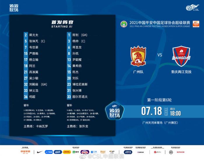 24直播网讯 北京时间18:00,中超第6轮广州队对阵重庆两江竞技。双方出场阵容已经公布。