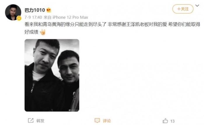 巴力在个人微博中写道:看来我和青岛黄海的缘分只能走到尽头了,非常感谢王泽凯老板对我的爱,希望你们能取得好成绩。