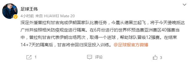 王伟在微博中表示,在6月份进行的世界杯预选赛亚洲赛区40强赛当中,普拉利甘吉代表伊朗出场两次,取得一个进球(对柬埔寨),帮助球队晋级12强赛。在结束14+7天的隔离后,甘吉将会回归深足投入训练。