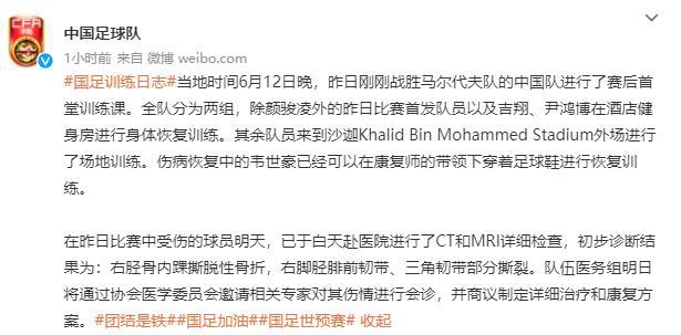 24直播网讯 据中国足球队官方消息,球队后卫明天右胫骨内踝撕脱性骨折,右脚胫腓前韧带、三角韧带部分撕裂。