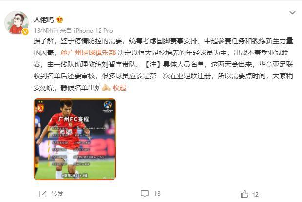 这位记者表示:据了解,鉴于疫情防控的需要,统筹考虑国脚赛事安排、中超参赛任务和锻炼新生力量的因素,广州足球俱乐部决定以恒大足校培养的年轻球员为主,出战本赛季亚冠联赛,由一线队助理教练刘智宇带队。【注】具体人员名单,这两天会出来,毕竟亚足联收到名单后还要审核,很多球员应该是第一次在亚足联注册,所以需要点时间,大家稍安勿躁,静候名单出炉
