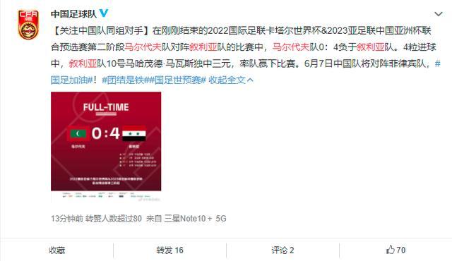 这场比赛中,叙利亚队10号马哈茂德·马瓦斯独中三元,率队赢下比赛。赛后中国国足在社媒关注了这场比赛的比分,做到知己知彼。