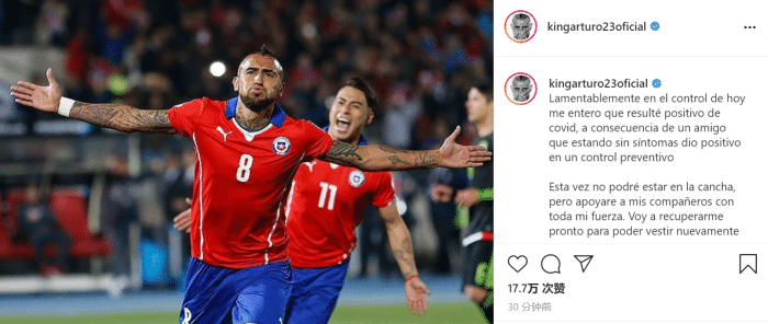 智利国家队表示,全队其他成员的检测结果均为阴性,现在比达尔已被隔离。
