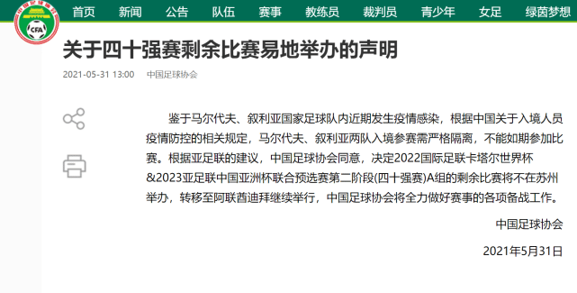 当国足7球击败关岛,马尔代夫无法进入中国考虑退赛的时候,中国足协的官网发布的一则通知足以让大家怀疑人生。根据中国足协的消息称,因为叙利亚和马尔代夫的球员遭到感染,未能准时来中国进行隔离和比赛。所以中国足协同意了亚足联的建议,把余下的三场主场比赛取消,改为在阿联酋的迪拜进行。也就是,中国男足之前的如意算盘全部打乱了。
