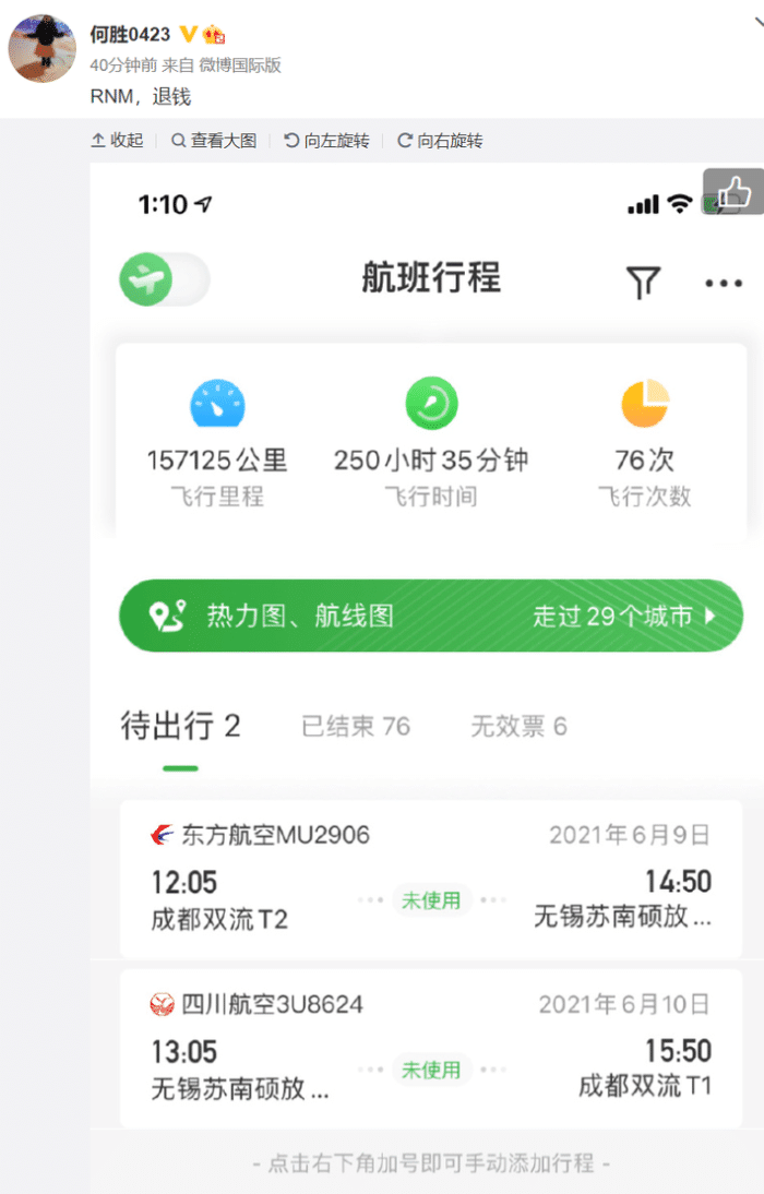 退钱哥何胜已经买了苏州赛区国足比赛的门票,得知消息后他在微博上晒出自己的航班行程,并发出经典金句:“RNM,退钱。”