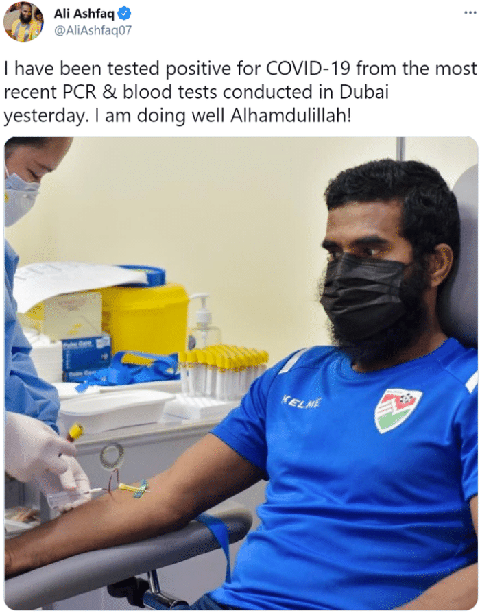 24直播网讯 马尔代夫传奇老将阿里-阿什法克日前在推特上证实自己感染新冠,将无缘参加对阵中国的40强赛。
