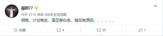 明晚19:30分,国足将在世预赛中对阵关岛,原本国足将穿红色主场球衣,但因计划有变,国足将改穿白色球衣。