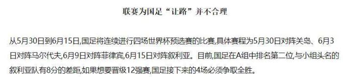 该媒体还称,即便国足真与中超联赛发生时间冲突,足协未必敢冒着得罪球迷、得罪赞助商、转播方等风取消联赛。当然,前提还是国足先得闯过40强赛这一关。