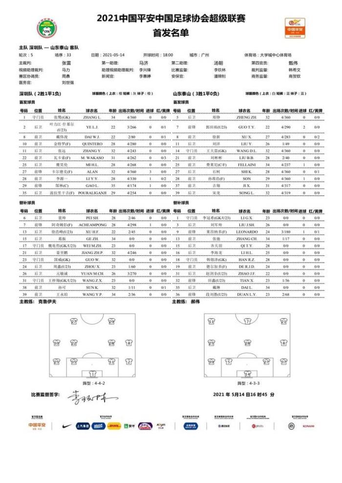 24直播网讯北京时间5月14日18:00,中超第五轮,深圳将迎战山东泰山。赛前,双方公布了本场比赛的名单。