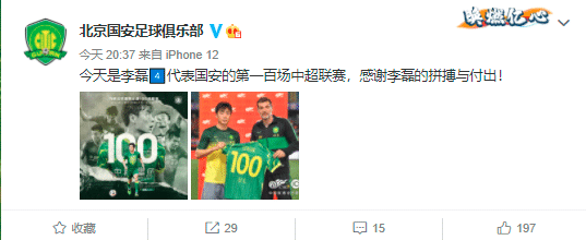 北京国安也在微博祝贺李磊百场:“今天是李磊代表国安的第一百场中超联赛,感谢李磊的拼搏与付出!”