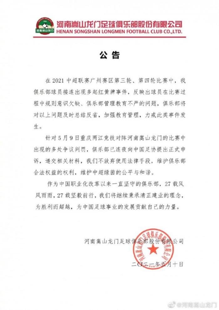 针对5月9日重庆两江竞技对阵河南嵩山龙门的比赛中出现的多处争议判罚,俱乐部已连夜向中国足协提出正式申诉,递交相关材料,我们不放弃使用法律手段,维护俱乐部合法权益的权利,维护中超绿茵的公平与和谐。
