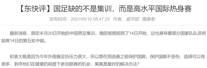 原定本月20日开始的中国男足集训,确定被提前到了14日开始,这也意味着部分国家队队员将缺席14日的第五轮中超。东体表示,足球运动员的竞技状态,从来都是通过有规律的高质量比赛获得,而不是单纯的休息、调整和训练。
