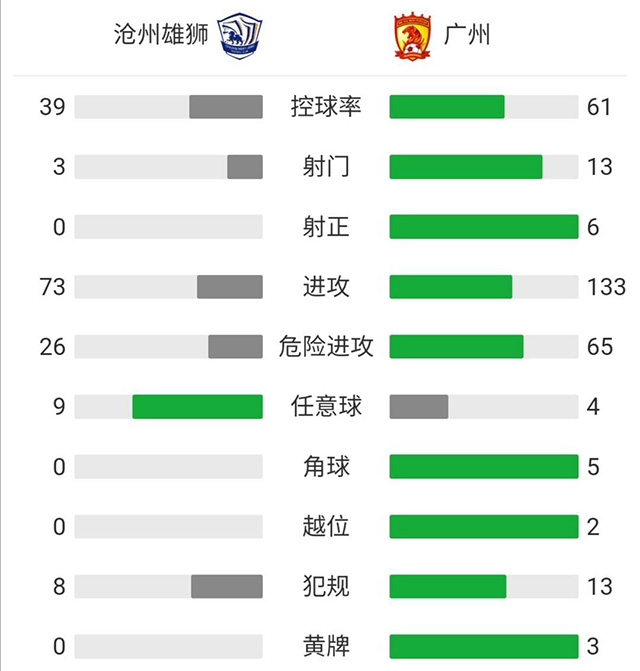 全场比赛结束,广州队2-0击败沧州雄狮。