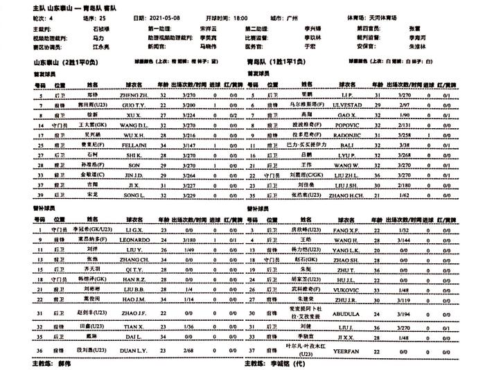 24直播网讯 北京时间5月8日,中超联赛第4轮展开争夺,首场比赛是齐鲁德比,泰山队对阵青岛队。赛前,双方首发名单公布。