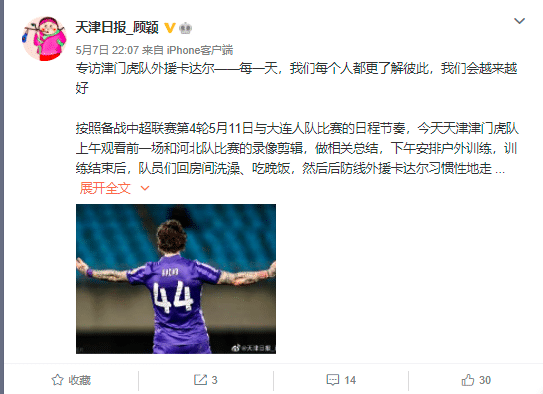 卡达尔:感谢天津球迷对我们球队、对我的支持,我很感动,可能有些话,我一时不知道怎么表达,但是请大家相信,为了天津这座城市、为了天津足球,我们一直在努力,我坚信经过一段时间,我们球队会越来越好,也请大家相信我们!