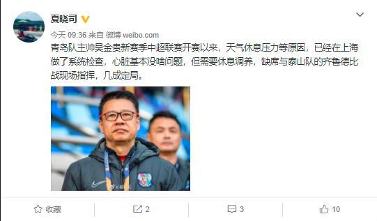 夏晓司在微博中写道:“青岛队主帅吴金贵新赛季中超联赛开赛以来,天气休息压力等原因,已经在上海做了系统检查,心脏基本没啥问题,但需要休息调养,缺席与泰山队的齐鲁德比战现场指挥,几成定局。 ”