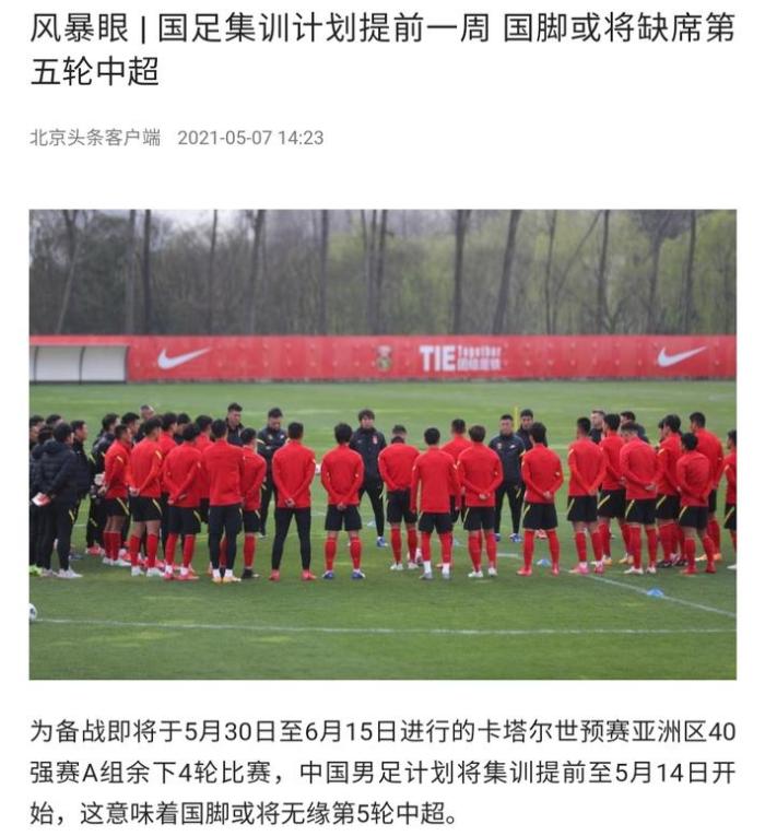 24直播网讯 5月7日据《北京青年报》报道,由于国足新一期的集训将提前开始,这意味着国脚或将无缘第5轮中超。