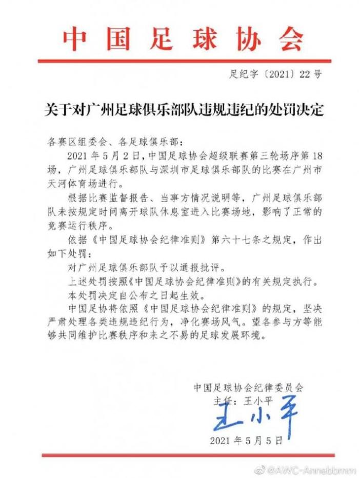 24直播网讯5月5日消息,足协官方公布处罚公告,广州队因为在对深圳队时未按规定时间离开更衣室进入场地,被通报批评。
