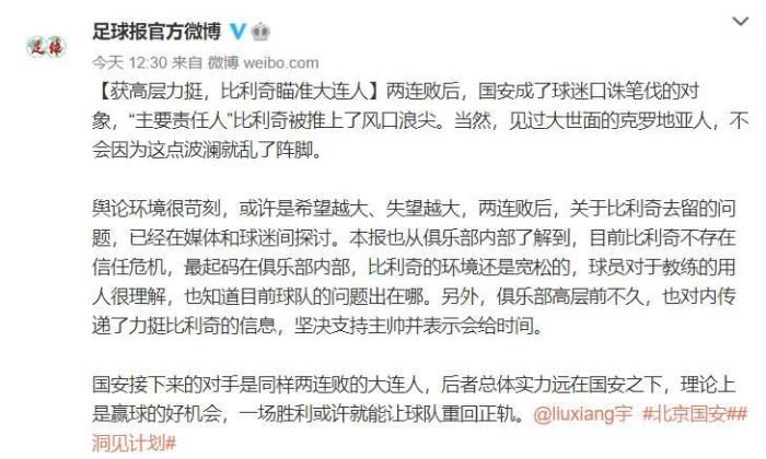 24直播网讯本赛季中超,北京国安开局不利吞下两连败,新帅比利奇被推上风口浪尖。但是,据《足球报》报道比利奇没有信任危机,他已经获得国安高层力挺。