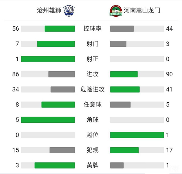 全场比赛结束,沧州雄狮0-0与河南嵩山龙门0-0互交白卷,双方都拿到新赛季第一个积分。