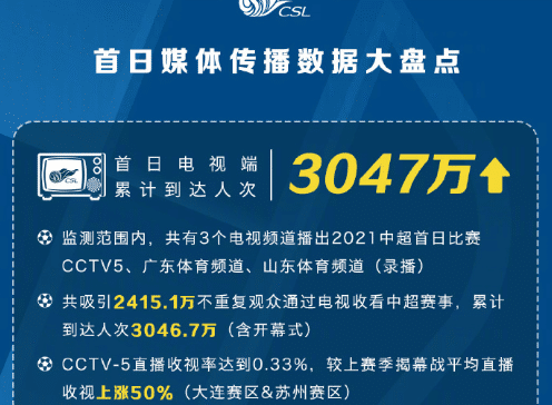 这样的数据不仅比去年高了50%,还比今年中国女足最重要的比赛奥运会预选赛次回合,中国女足在苏州通过加时赛以2-2战平韩国队,总分晋级到东京奥运会的收视率高。当时这场比赛电视覆盖的人数超过2千万,还是周二下午的4点新的收视纪录。不过联想到中超的开幕式和揭幕战是在晚上进行的,所以覆盖超过3000万,比中国女足的生死战高一些也就可以理解了。