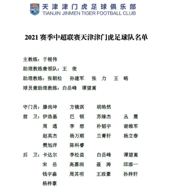 24直播网讯北京时间4月14日,中超天津津门虎官方宣布新队徽和新赛季的球队名单。于根伟担任主帅,谭望嵩和白岳峰担任球员兼任助理教练,泰山队的李松益、卡达尔和陈科睿租借天津,成为球队的主力选择。