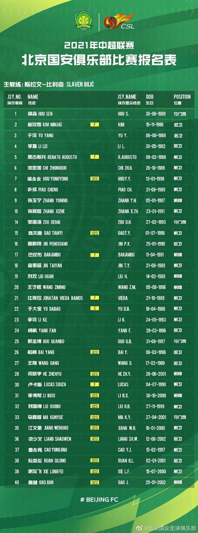 北京时间4月13日,北京国安2021赛季中超大名单出炉,五大外援金玟哉、奥古斯托、巴坎布、比埃拉和卢卡斯-索萨悉数入选。