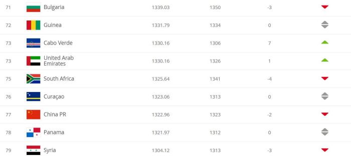 来自非洲的国家佛得角,由于他们在最近的非洲杯预选赛中接连战胜喀麦隆和莫桑比克,他们的排名得以上升7名排在国足之前。作为曾经葡萄牙的殖民地,佛得角许多球员都效力于葡萄牙联赛。