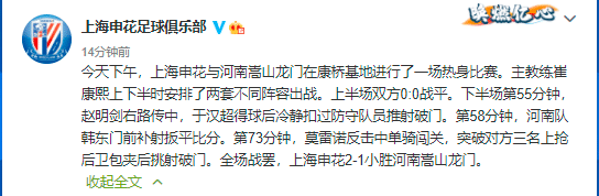 24直播网讯北京时间4月3日下午,在申花康桥基地进行的一场热身赛中,上海申花以2-1的比分击败了河南嵩山龙门。